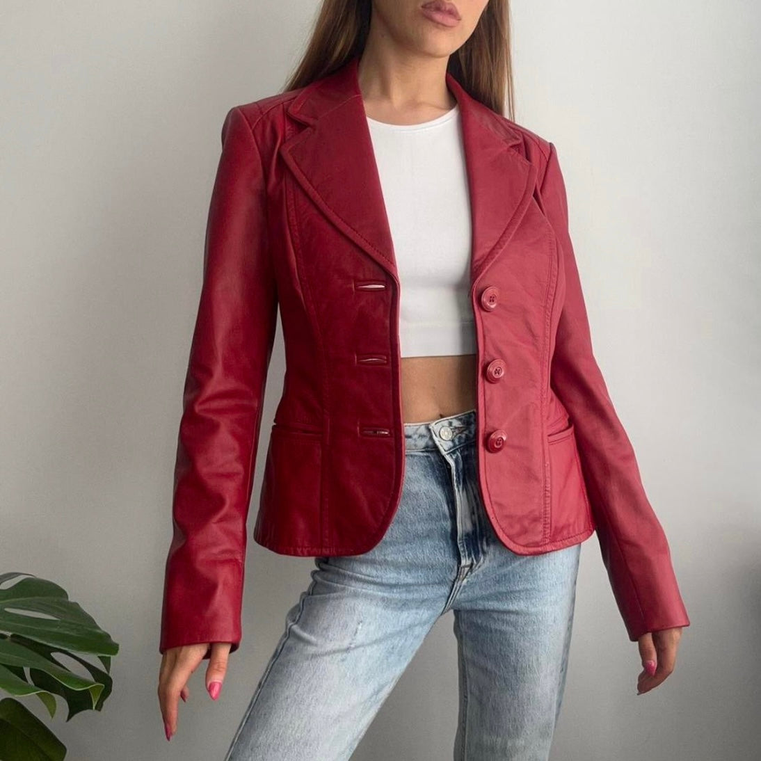 Bright red genuine leather blazer jacket