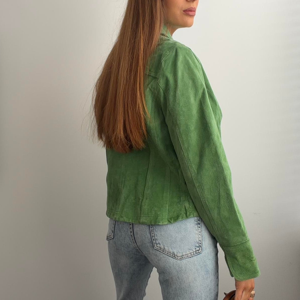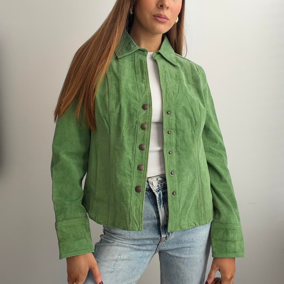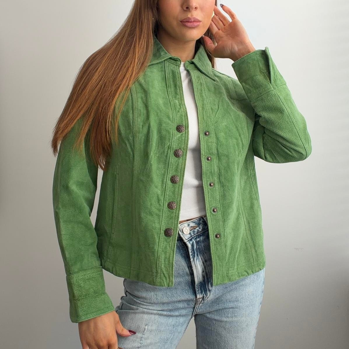 Green suede leather jacket with bronze buttons