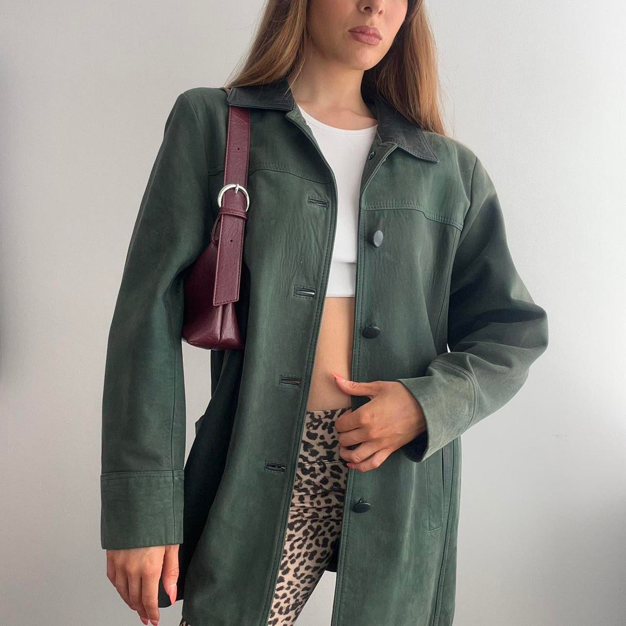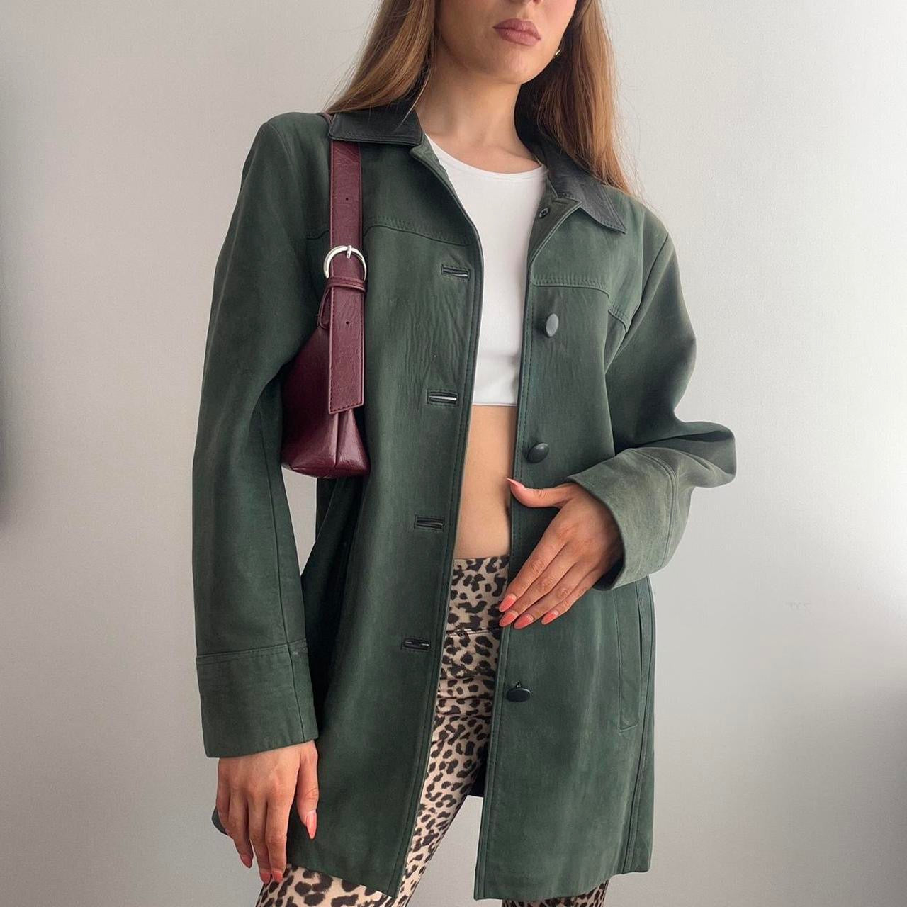 Green vintage and unique suede leather jacket with a relaxed fit jacket and button up design